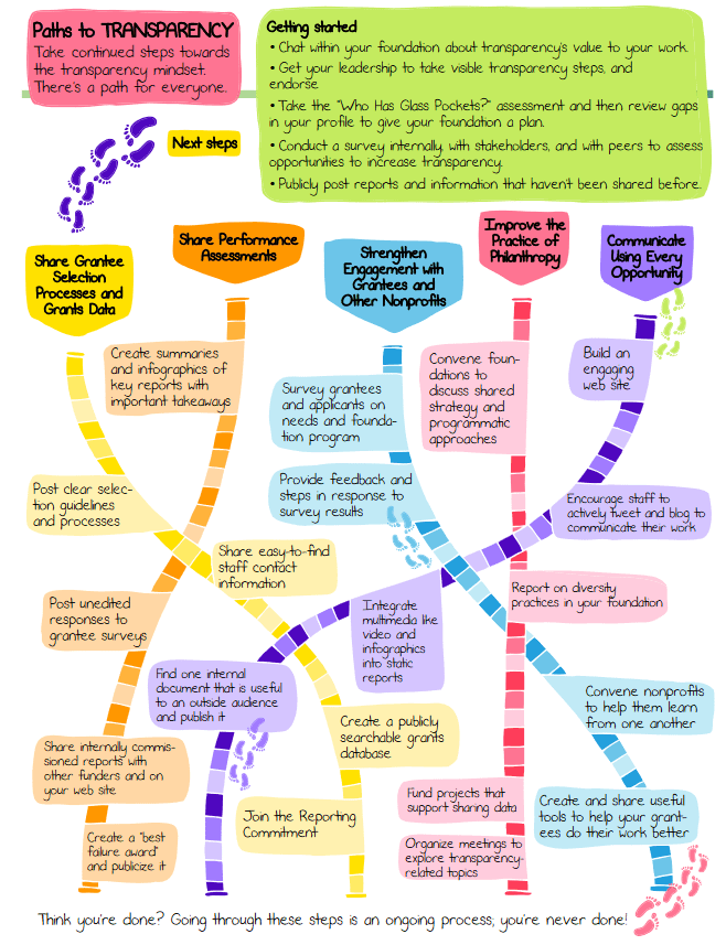 - Opening Up: Demystifying Funder Transparency – This report explores how transparency can strengthen credibility, improve grantee relationships, facilitate greater collaboration, increase public trust, reduce duplication of effort, and build communities of shared learning.
